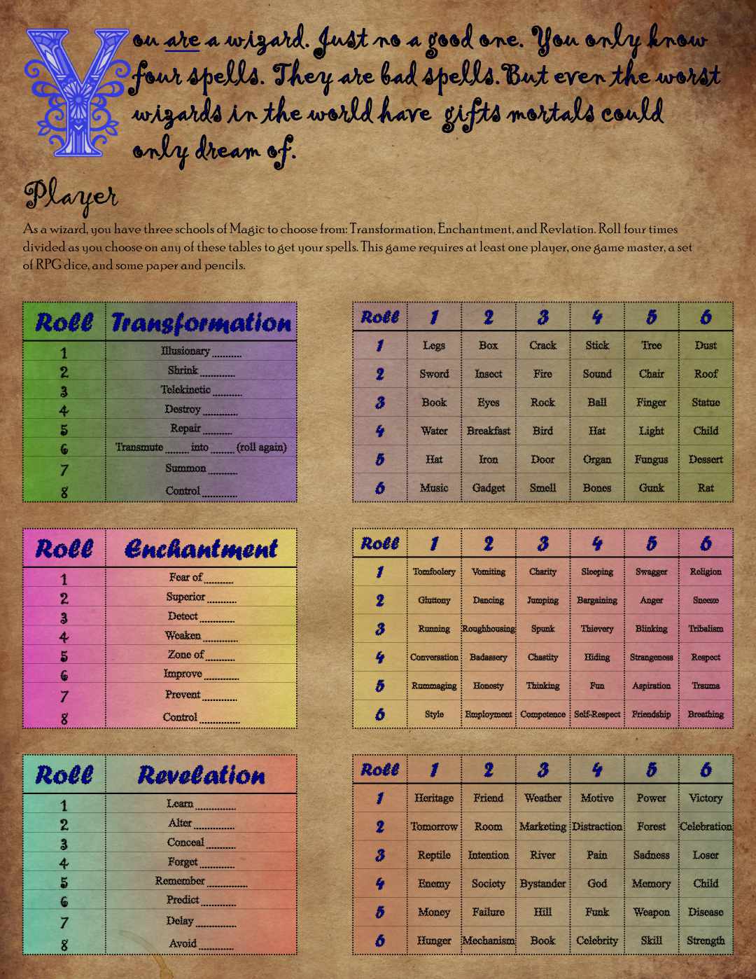 Bad Wizards is a rules-lite tabletop roleplaying game that caters to these arcanists. It contains tables and rules that allow the creation of many not all-that-useful spells such as Move Fungus or Detect Self-Respect. Only the cleverest of players will find a way to lead such a character to victory.
